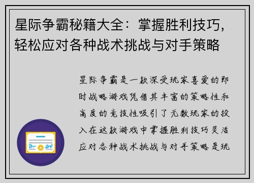 星际争霸秘籍大全:掌握胜利技巧,轻松应对各种战术挑战与对手策略