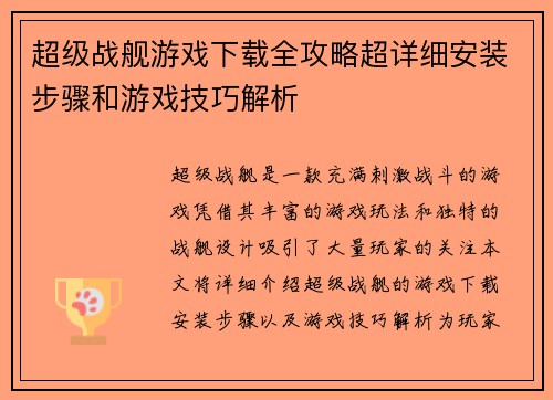 超级战舰游戏下载全攻略超详细安装步骤和游戏技巧解析