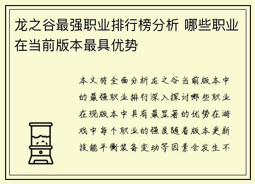 龙之谷最强职业排行榜分析 哪些职业在当前版本最具优势